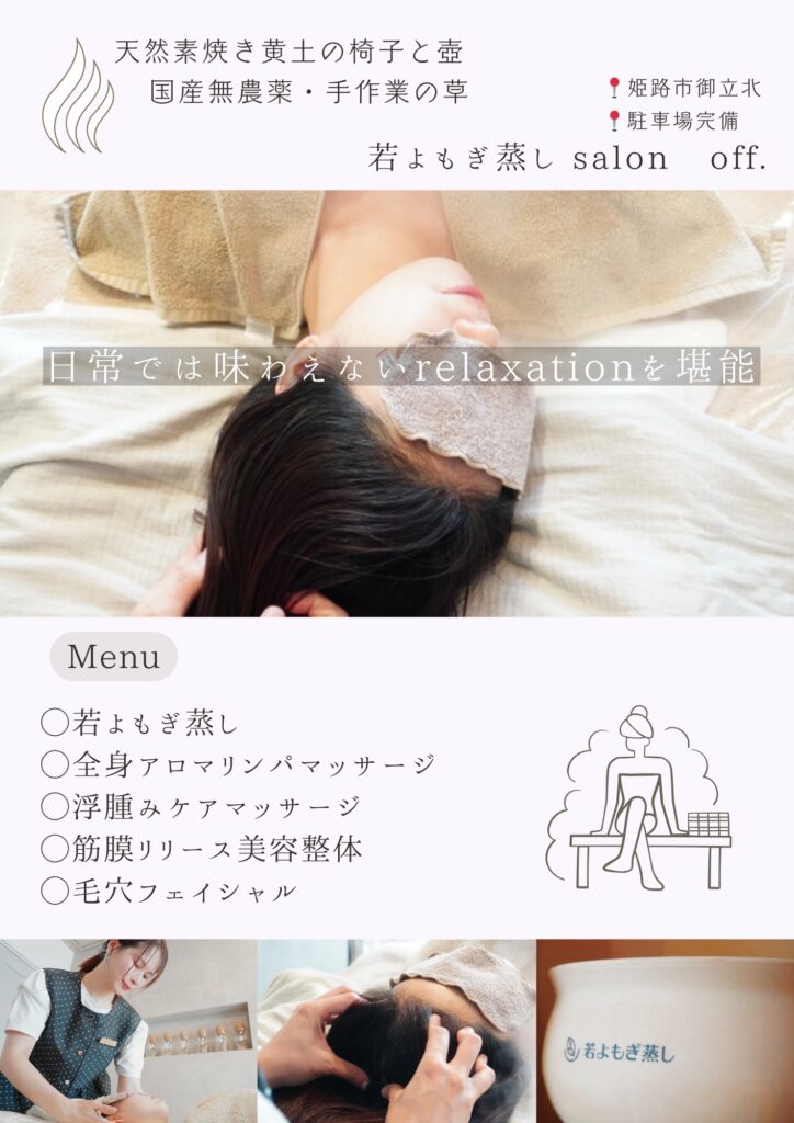 MESSAGEメッセージ 完全手作業・無農薬の草だから叶う、全身美容の若よもぎ蒸し。忙しい毎日からふっと離れて、深呼吸を思い出せる空間で、自分と優しく向き合う時間をお届けいたします。 コンセプト off.の特徴 天然素焼き黄土の椅子と壺使用 アンチエイジング 通いやすいプライベートサロン! アロマリンパメニューあり メニュー CUSTOMERカスタマー お客様の声 サロンSALON 大人の女性がほっと一息つける、山の上の静かな自宅サロン。心地よい眺めと穏やかな空間で、日常をそっと手放せるリラックスタイムをお届けします。 MORE FAQよくあるご質問 投稿がありません。 MORE BLOGブログ NEWS 姫路市の若よもぎ蒸しサロン「off.」 2025.11.27 MORE